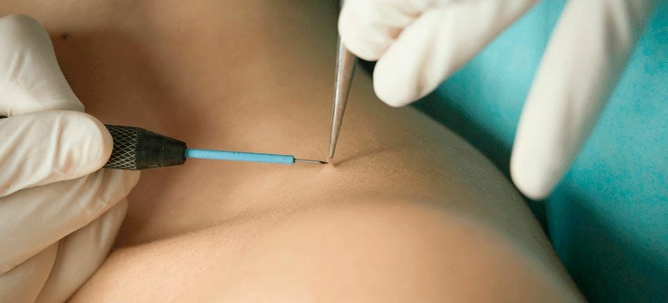 Электрокоагуляция — удаление электрическим током. Эффективный метод, но может оставлять небольшие рубцы на тонкой коже шеи.